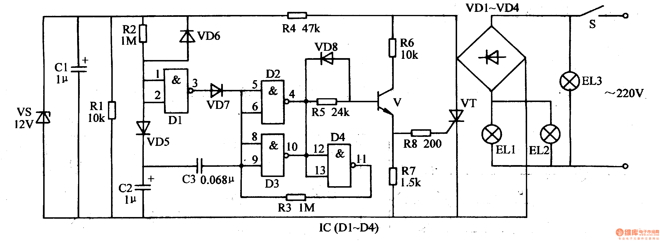 When S is connected, the 220v voltage will be put on the 3rd group of illuminations EL3 through S which will make EL3 illuminated. The other circuit will generate +12v voltage after it is rectificated by VD1-VD4, current-limited and voltage-reducted by M, filtrated by C1, stablized by VS. Apart from providing IC with working power, the +12v voltage will charge C2 through R2 and VD5.