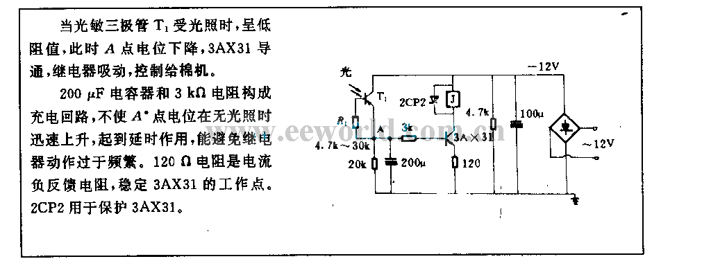 When phototransistor T1 has illumination, it is low resistivity, then the potential in A point is falling, 3AX31 is conduction, relay is pull-in, to control the cotton feeder.