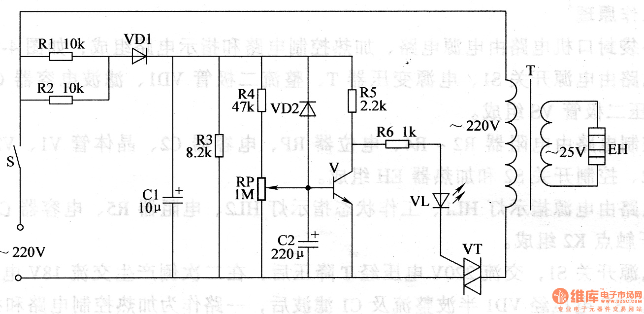 When the working power is on, V is disconnected. C1's voltage is put on VT and VT is connected. 220v voltage will be put on T through S and VT. Then it will provide EH with working power after reduction. Then EH will be heated and seal the bag. When C2's voltage reaches 0.7v, V is connected and EH stops working. When the handle is released, S is disconnected and C2 is discharged, prepared to charge for the next time.