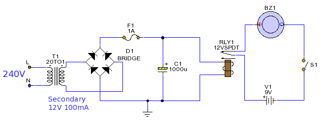 This is a very basic alarm designed to let you know when the electricity supply fails. The alarm is powered from a battery which uses no current consumption at all in standby, a battery should therefore last its full shelf life.