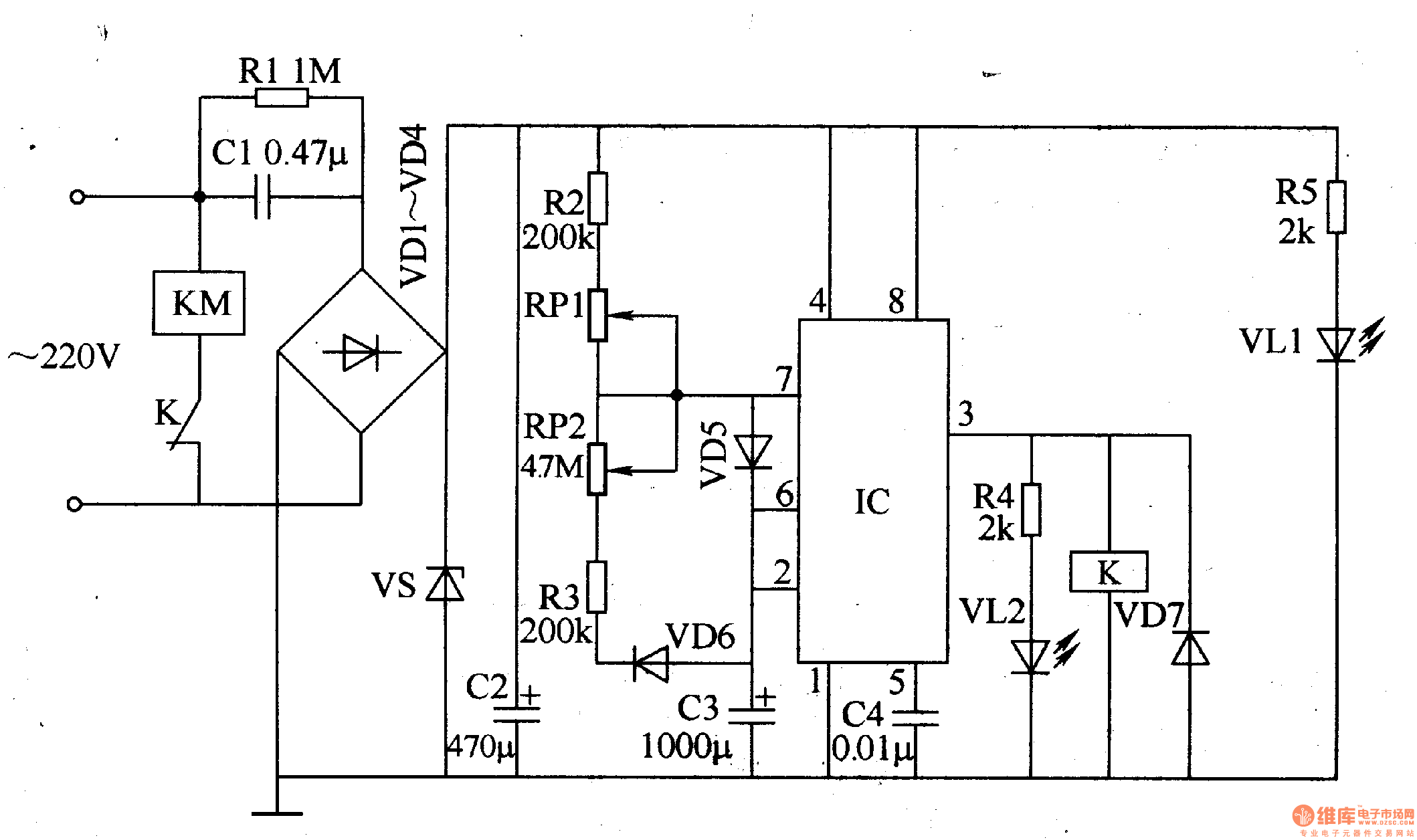 Power circuit consists of Buck capacitor Cl, resistors Rl, R5, rectifier diode VDl-VD4, voltage regulator diode VS, power indicator light-emitting diode VL1and filter capacitor C2.