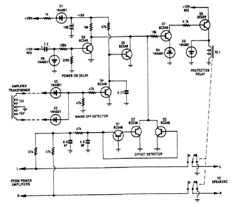 Transistors Q1, Q2, and Q3 monitor the two outputs of the stereo amplifier. If the offsets exceed ±2 V, Q7 is turned off, which turns off Q8 and the normally on relay. Diodes D2 and D5, together vith Q4, provide a mains voltage monitor. As soon as the ac input voltage disappears, as when the ampli-fier is turned off, Q4 turns off and Q5 turns on. This turns off Q7, Q8, and the relay. Hence, the loud-speakers are disconnected immediately after the amplifier is turned off.