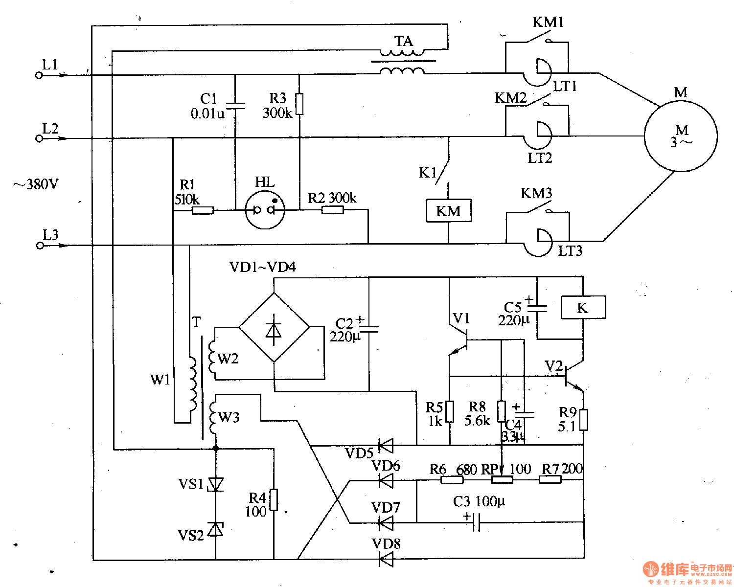 Once it is powered, 380V AV voltage will be supplied to motor M through reator LTl-LT3. In the same time current transformer TA will produce sensor signal voltage which will make V1 and V2 saturated conducted. Then the motor will work with full voltage. When the motor is work it maybe has light load or even no load. So the sensor signal voltage on current transformer TA will reduce and this leads to the motor's decompressed operation. When the motor's load is becoming heavier, and the sensor signal voltage on current transformer TA reaches a vertain figure, the motor will work with full voltage.