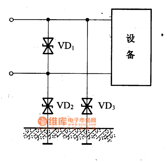 When lightning occurs and generates the overvoltage, the over-voltage current can pass transient voltage between lines and ground to suppress diodes VD2, VD3 from connecting to the earth, and their ground voltage difference is further inhibited by the bipolar transient voltage suppression diode VD1 between two lines, so that the equipment is protected.