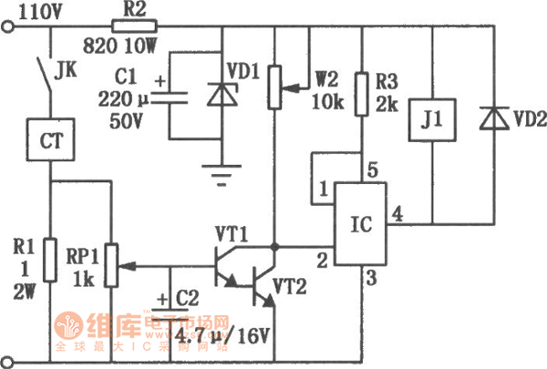 The signal from the sampling circuit is amplified by voltage, whichmakes the collector potential of VTl, VT2 close to 0V, the ② pin of IC's is at the low potential , ④ pin is turned on, relay J1 gets the power. The dynamic co-contact is closed, so that the machine starts to work. When the magnetic chuck current is less than 90% of rated current (this value is adjustable), IC's ④ pin is stopped. J1 is off, the machine feed-through circuit is off at the same time. The feed-though system stops working, thus avoids the accident. This circuit IC uses TWH8751 type, VTl uses 9013-type, VT2 uses 3DGl2 type, VDl uses 24V, 1W. VD2 uses lN4148 type, relay J1 uses JTX-24 type.