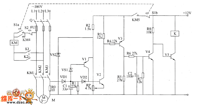 The motor protector circuit is composed of the current detection control circuit and delay control circuit, and the circuit is shown as the chart. Current detection control circuit is composed of the resistors R0 ~ R5, transistors V1 ~ 171VJ, capacitor C1, diodes VD1 and VD2, Zener diode VS1 and VS2. Delay control circuit consists of resistors R6 ~ R8, capacitor C2, transistors V4, V5 and relay Κ. S1 is the start button, S2 is the stop button, KM is the AC contactor. R0 selects 20W wire wound resistor; R1 ~ R8 select 1/4W metal film resistors. RP uses film variable resistor. C1 and C2 select aluminum electrolytic capacitors with the voltage above 10V. VD1 and VD2 use 1N4007 silicon rectifier diodes. VS1 and VS2 use 1W silicon Zener diodes.