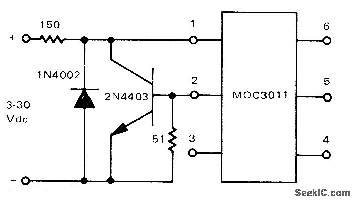 Combination of diode and transistor limits input current to LED of Motorola MOC3011 optoisolator to safe maximum of less than 15 mA for input voltage range of 3-30 VDC. Circuit also protects LED from accidental reversal of polarity.-P.O 'Neil, “Applications of the MOC3011 Triac Driver,” Motorola, Phoenix, AZ, 1978, AN-780, p 4.