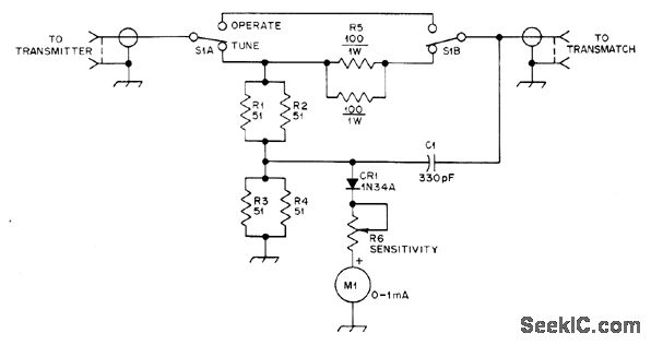 Simple resistive SWR bridge provides dummy load, relative power output indicator, and safe method of tuning transmitter without destroying transistors because of mismatched load. Input divider R1-R4 has total resistance of 50 ohms, using 1/2-W composition resistors, for dissipating transmitter output when S1 is in TUNE position. M1 indicates relative power applied to this load. Antenna is connected through Transmatch, and antenna tuner is adjusted for minimum deflection or lowest SWR. RE isolates transmitter from antenna. With S1 in OPERATE position, M1 indicates relative power output into antenna.-A S. Woodhull, Simplified Output Metering Protects QRP Transmitters, QST, April 1977, p 57.