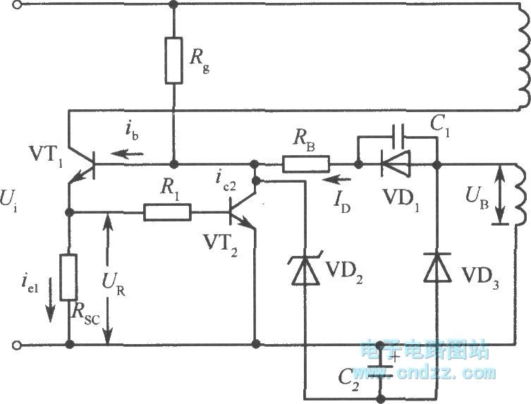 When VT1 tube's current is enlarging, the voltage generatedby resistor Rsc is enlarging, VT1's base potential increases, driving current Id decreases. So VT1's base current is limited, VT1's collector current is limited to a fix number. We can know from the diagram, if drop voltage generated by switching transistor VT1's collector current on resistor Rsc is more than VT2's Ube2, VT2 is breaking over, it canmake VT1's base current divide a part, thereby it can make sure the collector current of VT1be less than protection value.