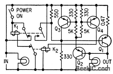 Current greater than 3 amp flowing through 0.47-ohm resistor in emitter of current-switching transistor Q1 drops voltage on base of Q2, causing Q2, Q3, and Q4 to saturate. Q3 opens circuit immediately and keeps it open for duration of overload, For complete short-circuits, Q4 latches K2 to provide positive protection.-F. W. Kear, Fast-Response Over-loud Protection, Electronics, 33:7, p125.