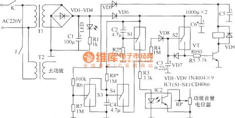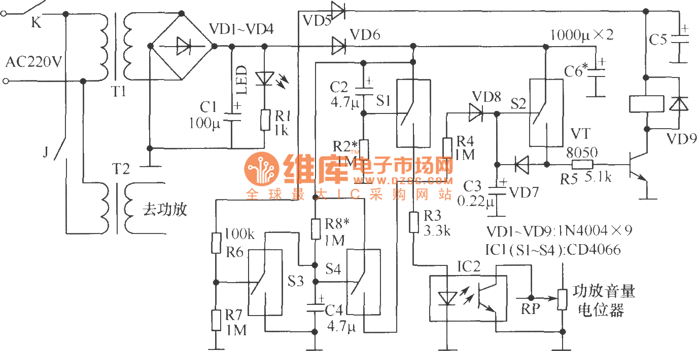In the Figure, K is a power switch, T1 is the controlling small power transformer, T2 is the amplifier power transformer. IC1 (S1-S4) is the four - way analog switch CD4066. When the machine is open, K1 is closed, C1 gets 12V DC voltage. The S3 gets conduction because control terminal is high, then S4 control terminal is pulled low, S4 disconnects. C2 voltage can not get mutation, so S1 gets conduction when machines is open due to the control terminal is in high level, and optocoupler IC2 LED is lit.
