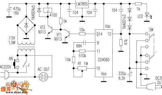 Befeore it gets power, the timing clock generator is reset by the capactor of the pin 12 of IC, and the various output stages are in low potential. Because out-port Q14 outputs low level, the triode VT1 closes, the VT2 is breakover, relay J gets the electricity, then the contacts pull in. AC OUT is the AC output socket, which may serve as the head light, miniature ceiling fan and other AC electric appliances without timing device. The CD4060 integrated circuit has the 14-level binary counting/divider with clock pulse oscillator. Adjusting potentiometer RT can change the fixed time, and the timing time is approximately between 20 second ~4.5 hour.