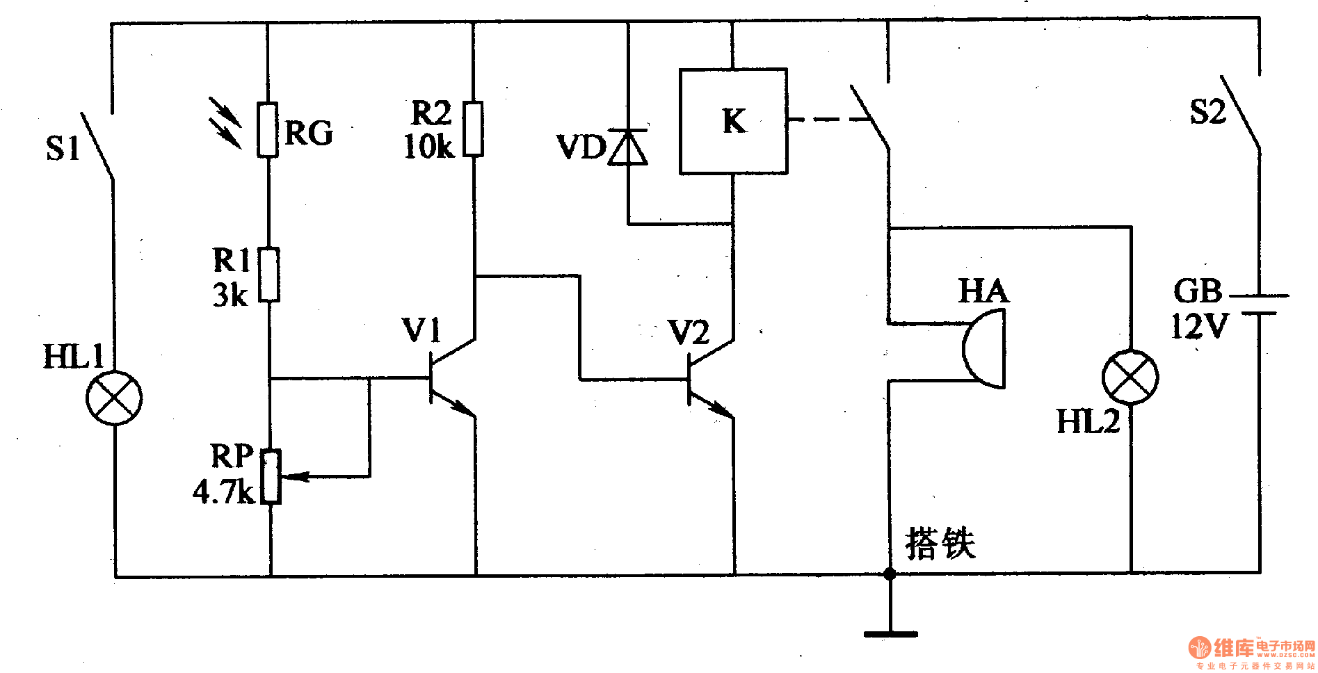 The principle of circuitThis united reaper full warehouse reminder circuit is formed by the photoelectric detection amplification circuit and the sound and light alarm circuit,which is shown in Figure 4-99.The photoelectric detection amplification circuit is formed by the indicator light HL1,light switche S1,photosensitive resistor and transistor V1. The sound and light alarm circuit consists of transistor V2, the relay K, the diode VD, indicator light HL2 and buzzer HA.