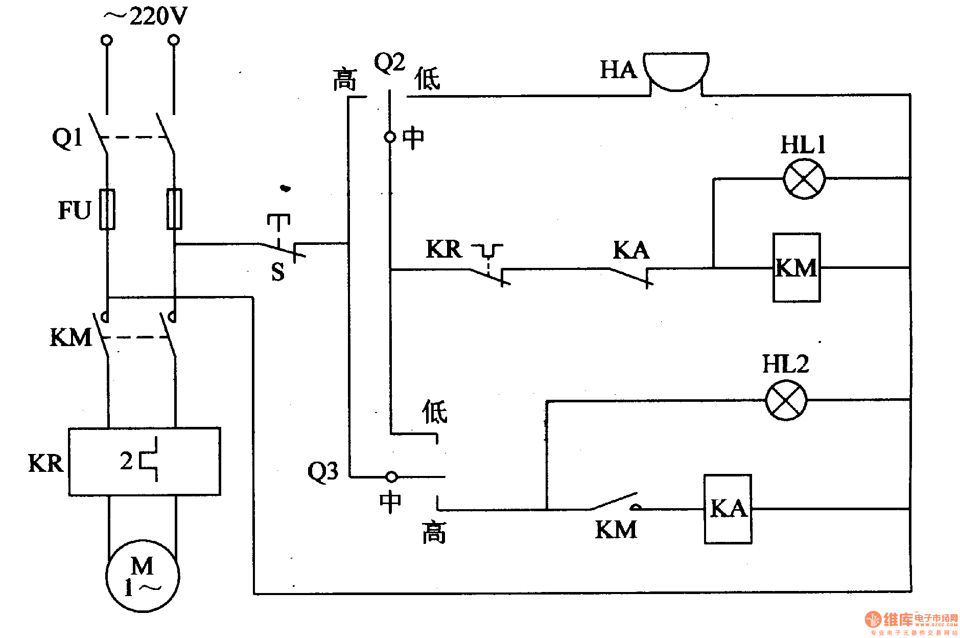 This example describes the agricultural non-tower pressure-charged water feeder,and it uses electric connecting pressure gauge as the measurement and control device.The circuit is simple, and it can cut off the power supply automatically when the water supply is not enough or the submersible pump fails to work,while the alarm sends a sound. The principle of circuit This agricultural non-tower pressure-charged water feeder circuit is formed by the knife switch Q1,fuse FU,intermediate relay KA,AC contactor KM, thermal relay KR,alarm HA, lights HL1,HL2 and the control contact of pump outlet pressure gauge Q2,control contact of tank water level testing gauge Q3, which is shown in figure 4-153.