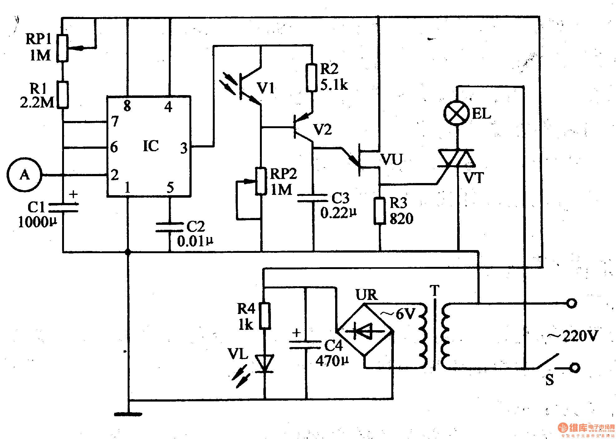 This example describes the eyes care lamp with functions like touch-sensitive light and turn off timing,and it can dim the light level according to the intensity of indoor light level automatically. γ The principle of circuitThe eyes care lamp circuit is formed by the power circuit, touch/timing control circuit and metering and dimming circuit,which is shown in Figure 1-19 γγThe power circuit is formed by the power switch S,the power transformer T,bridge rectifier UR,filter capacitor C4,current limiting resistor R4 and the power indicative light-emitting diode VL.