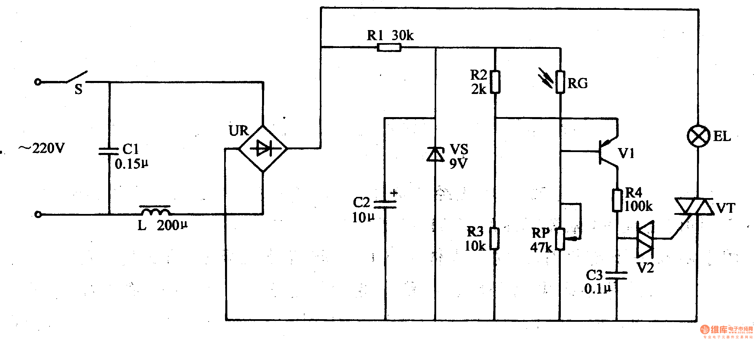This example describes the eyes care lamp,which can dim the light level based on the intensity of indoor light level automatically. And it can protect the eyes and it is suitable for reading and writing. The principle of circuitThe eyes care lamp circuit is formed by the power circuit and optical control circuit,which is shown in Figure 1-192. Power supply circuit is formed by the power switch S, filter capacitors C1,C2,inductor L,bridge rectifier UR, current limiting resistor R1 and diode voltage regulator VS. The optical control circuit is formed by the photosensitive resistor RC, resistors R2-R4, potentiometer RP, capacitor C3, transistor V1,and dual-track trigger diode V2 and thyristor VT.