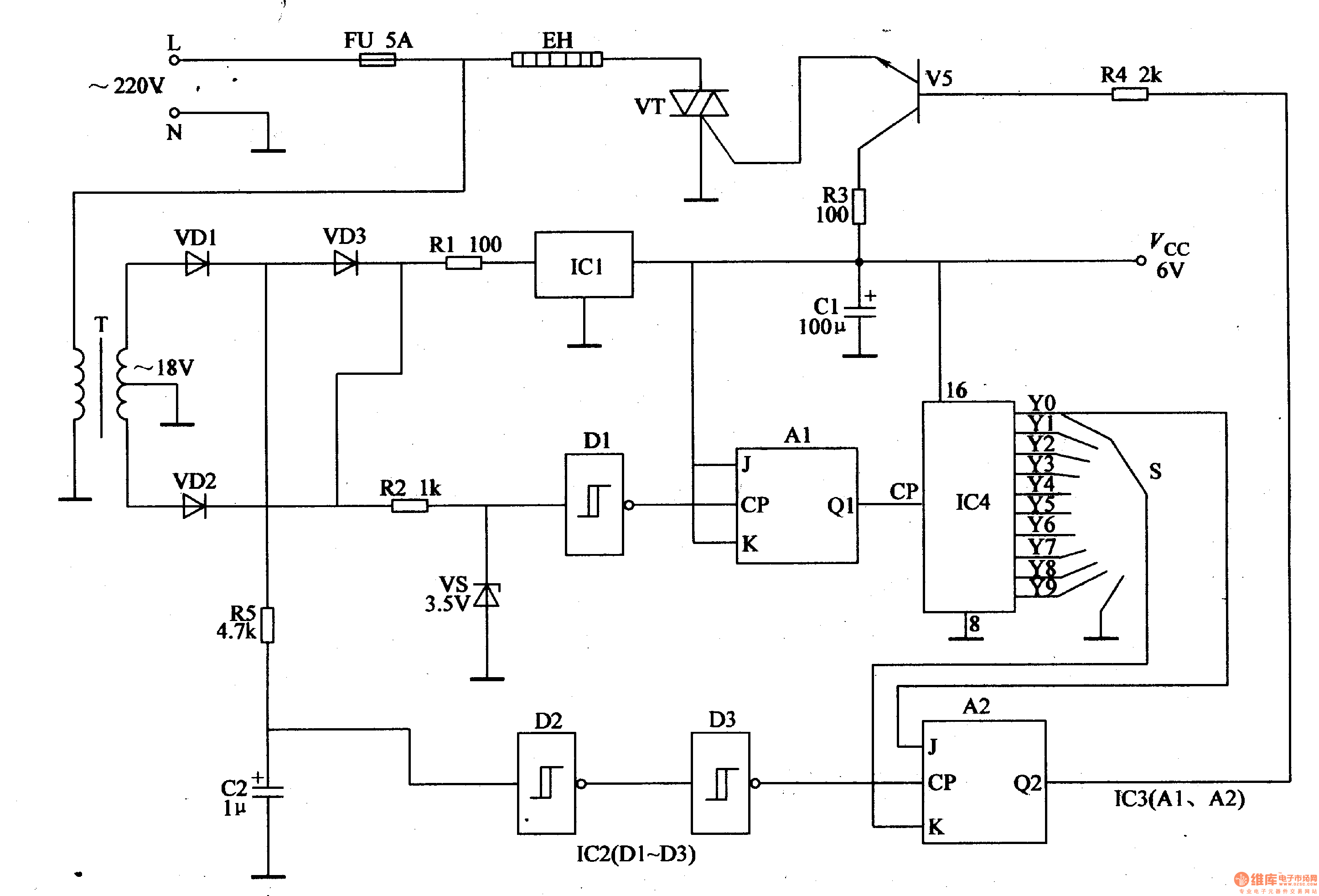 This example describes the greenhouse ground hotline controller, which uses the cycle rate control,and it is of advantages like energy saving, small harmonic interference and so on. The principle of circuitThe greenhouse ground hotline controller circuit is formed by power supply circuit and heating control circuit, which is shown in figure 4-199. Power supply circuit is formed by the fuse FU,power transformer T,rectifier diodes VD1-VD3, resistor R1,three-terminal voltage regulator integrated circuit IC1 and filter capacitor C1. Heating control circuit consists of resistors R2-R5,capacitor C2,voltage regulator diode VS,non-gate Schmitt trigger integrated circuit IC2 (D1-D3), trigger JK integrated circuit IC3 (A1,A2,counting/pulse distribution integrated circuit IC4, selective switch S,the transistor V,thyristor VT and ground hotline EH.
