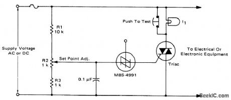 For positive protection ofelectrical or electronic equipment, use this against excessive supply voltage. Due to improper switching, wiring, short circuits, or failure of reg-ulators, an electronic crowbar circuit can quickly place a short circuit across the power lines, thereby dropping the voltage across the protected device to near zero and blowing a fuse. The triac and SBS are both bilateral devices, the circuit is equally useful on ac or dc supply lines. With the values shown for R1, R2, and R3, the crowbar operating point can be adjusted over the range of 60 to 120 volts dc or 42 to 84 volts ac. The resistor values can be changed to cover a different range of supply voltages. The voltage rating of the triac must be greater than the highest operating point as set by R2. I1 is a low power incandescent lamp with a voltage rating equal to the supply voltage. It may be used to check the set point and operation of the unit by opening the test switch and adjusting the input or set point to fire the SBS. An alarm unit such as the Mallory Sonalert may be connected across the fuse to provide an audible indication of crowbar action.(This circuit may not act on short, infrequent power line transients). (View)