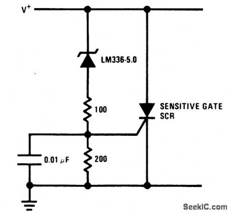 The silicon controllqd rectifier (SCR) is rated to handle at least the current of the power supply. It is connected in parallel across the 12 V dc output lines, but remains inert until a voltage appears at the gate terminal. This triggering voltage is supplied by the zener diode. At potentials less than 14 V the zener will not conduct current. But, at potentials greater than 14 Vdc the zener conducts and creates a voltage drop across the 330 ohm resistor that will fire the SCR. When the SCR turns on, the output lines of the power supply are shorted to ground. This will blow the primary fuse or bum out the transformer if there is no primary fuse. (View)