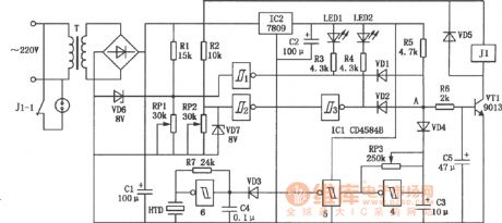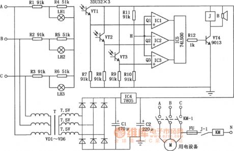 The circuit is voltage photoelectric sensor type three-phase broken circuit protector. It will make alarm sound and cut off the power supply automatically. The circuit is shown as above. (View)