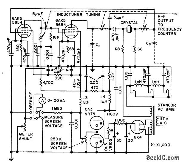 Rapidly measures equivalent parameters, in range of 75 to 200 Mc, by combining active and passive measuring systems. Crystal being measured controls frequency stabiltiy of oscillatory circuit of crystal impedance meter. -D. W. Robertson, Plug-in Bridge Checks VHF Quartz Crystals, Electronics, 3H9, p 82-85.