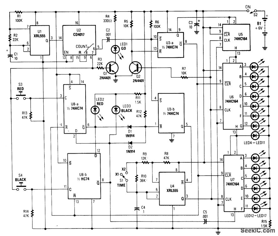 This circuit uses a timer to generate at a 5-ms clock rate.The pulses are shifted into the shift register,one at a time,lighting an LED.An auxiliary timer that generates one pulse per second is used to generate timing to activate the go LED and stare the 5ms pulses clocking into the registers.At the GO signal each player presses his buttons (S3 or S4).The delay (reaction time) is read out on LED4 to LED17;after six seconds,the sequence repeats.