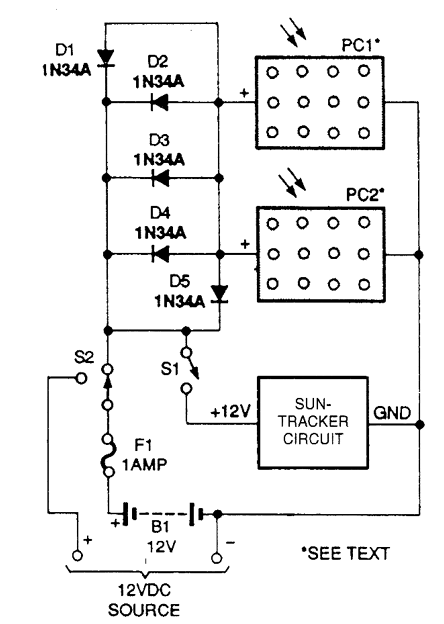 This application circuit provides rechargeable solar power for the sun tracker, as well as for another 12-volt device. PC1 and PC2 can be mounted on sun tracker assembly.