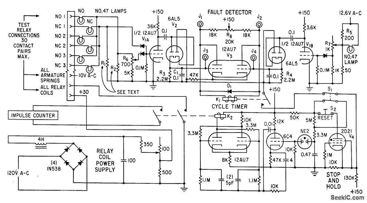 Up to 30 relays ore cycled automatically for minutes or hours to break in contacts and show up early defects. Tester stops and holds for intermittent con tact fault, and lights lamp to identify faulty contact.-F. Trainor, Automatic Relay Tester Delects Infermittents, Electronics, 33:50, 79-81.
