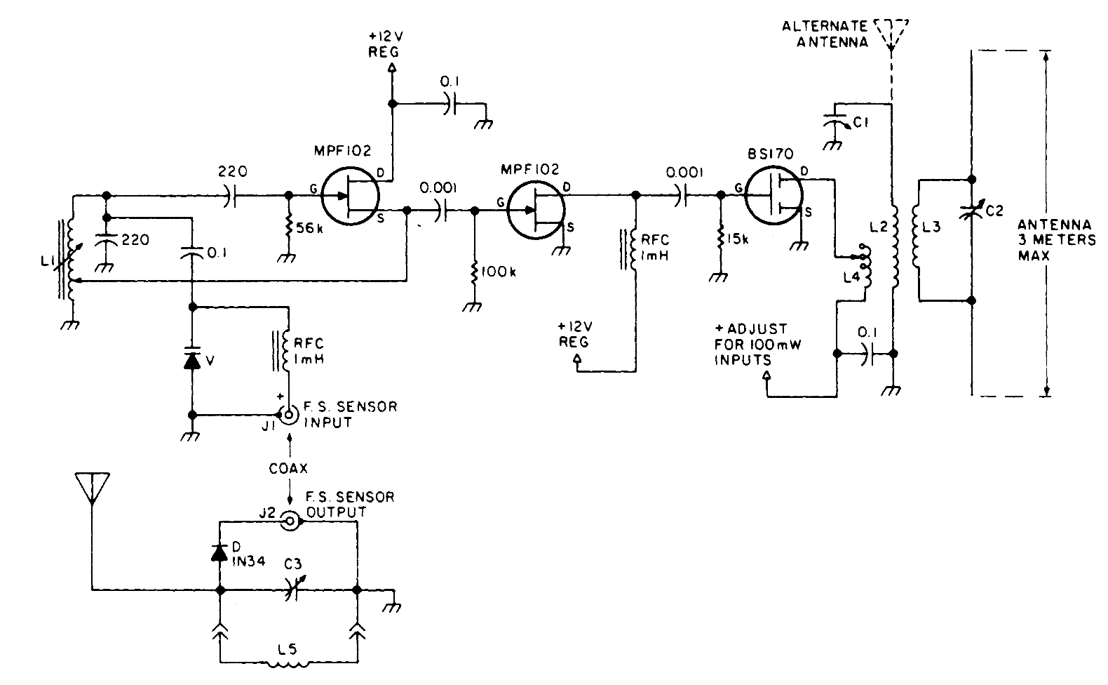 This field strength meter consists of a tuned crystal detector producing a dc output voltage from a transmitted signal. The dc voltage is used to shift the frequency of a transmitter of 100-mW power operating at 1650 kHz. The frequency shift is proportional to the received field strength. This unit has a range of several hundred feet and is operated under FCC part 15 rules (100-mW max power into a 2-m-long antenna between 510 and 1705 kHz).