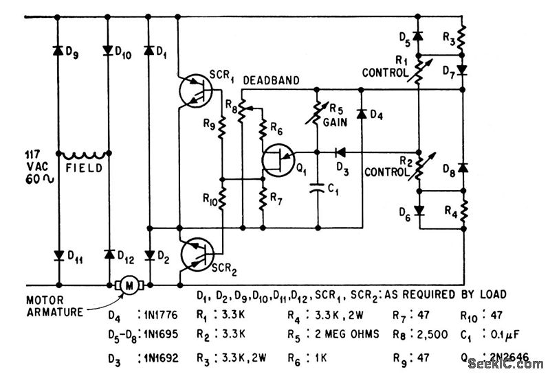 Silicon controlled recliners in Half-wave circuit act with unijunction transistor and two rheostats to adjust speed in either direction,-J. C. Hey, The Widening World of the SCR, Electronics, 37:25, p 78-85.