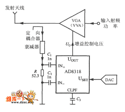 The working principle of the RF power control circuit is as shown in the figure. The controlled object can be the power amplifier (PA), the variable gain amplifier (VGA) and the variable voltage attenuator (VVA).etc. When you are selecting the control mode, you need to cut off the USET and UOUT pins. The measured RF power signal adds to the input port of the AD8318 through the directional coupler and the attenuator. The set voltage of AD8318 is got from the D/A converter (DAC). The gain control voltage which is output by the UOUT of AD8318 can be used to control the output power of VGA(or VVA).