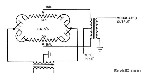 Can be operated with either input or output ungrounded. With 100-v rms carrier and d-c input of 30 v, output is linear up to 0.2 v rms. Null level is less than 1 mv, but drift stability is poor and balance is critical. Used in applications where modulation of error signal is re quired.-L. S. Klivans, Modulators for Automatic Control Systems, Electronics, 31:1, p 82-84.