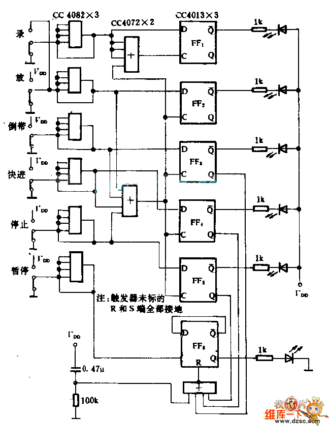 The CC4082 connects into the positive feedback, and trigger is composed of the CC4082 and the bar function switch to guarantee the output electrical signals has no jitter. The or door or the trigger simulates the operating logic of the recorder to make the six LEDs respectively indicate the states of recording, playing, tape rewinding, FF, stop and the pause.