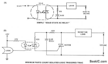 When zero voltage switching is not required, methods of providing this function are illustrated. The lowest parts count version of a solid-state relay is an optoisolator, the triac driver H11J. Unfortunately, the ability of the H11J to drive a load on a 60-Hz line is severely limited by its power dissipation and the dynamic characteristics of the detector. These factors limit applications to 30 - 50 mA resistive loads on 120 Vac, and slightly higher values at lower voltages. These values are compatible with neon lamp drive, pilot, and indicator incandescent bulbs; low voltage control circuits, such as furnace and bell circuits, if dV/dt are sufficient; but less than benign loads require a discrete triac.
