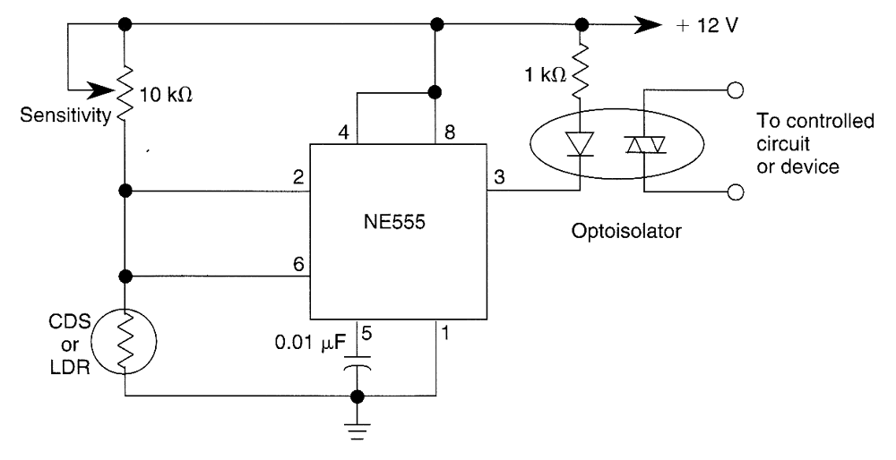 The hysteresis of a 555lC can be used to advantage for sensing a drop in light. An LDR or CDS cell with about 2 to 8 k resistance at desired light level should be used.