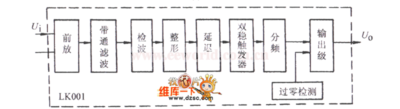 The circuit is as shown. It includes sound sensor BM, voice controlled IC, thyristor control circuit, imitation sound circuit and AC step-down rectifier circuit. Voice-specific integrated circuit LK001 is the core device of the circuit, whose internal function block circuit is shown.