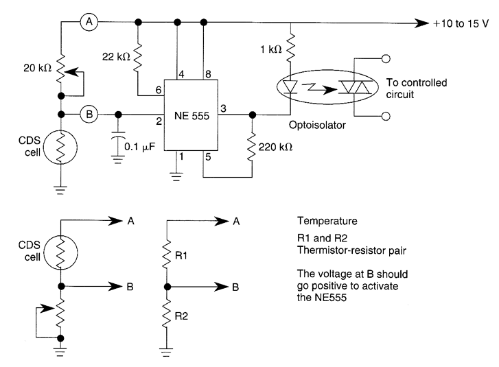 This dark-activated relay switch can be used to turn on walkway or other outdoor lighting at dusk. By using alternate connections to A and B, increasing illumination, high and low temperatures can be sensed.