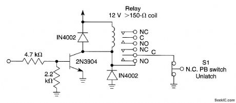 A 4-V signal will cause the relay to pull in when Q1 turns on. Latching is obtained by feedback through a 4.7-kΩ resistor. A switch is used to select latching or nonlatching operation. A NO pushbutton releases the circuit. (View)