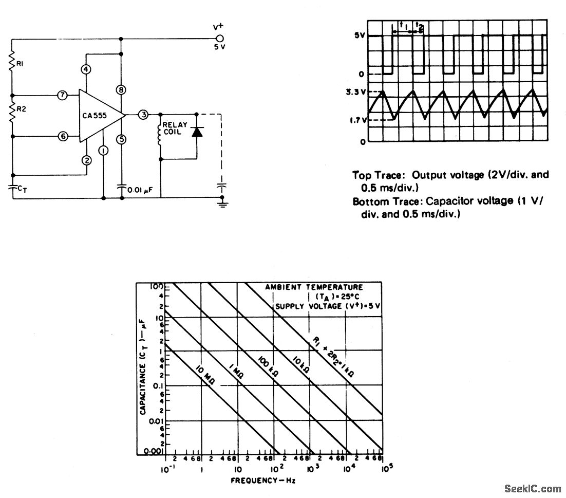 This circuit shows how a CA555 timer can be connected for astable (free-running) operation. Figure 3-13B shows typical waveforms. Figure 3-14C shows free-running frequency versus Rc for various values of R1 + R2 and CT.Notice that the total period is a function of both R1 and R2 as shown by T= 0.693 (R1 +R2)T C and t2= 0.6983 (R2)CT The duty cycle is t2/(t1+t2)= R2/(R1+ 2R2).