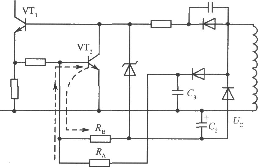 In the ringing current-limit switching power supply, the output current Io has no corresponding relationship with the primary stage current Ic. For the same collector electrode current Ic, with the rise of the input voltage, the Io will increase too. So in the ringing type switching circuit, in addition to use the start protection measures, we also need to set the protection circuit which is as shown in the figure. We add the RA and RB on the base subcircuit of VT2. Because the voltage of C3 is the positive polarity voltage which is proportional to the input voltage, so if the input voltage Vi rises, the current which flows through the resistance RA will increase to accelerate the conduction of VT2.