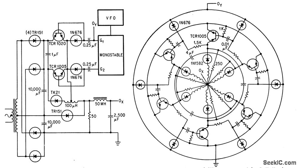Speed range of 1,200 to 18,000 rpm is obtained with 400-cps, six-pole fractional-hp hysteresis motor by modifying scr ring counter to work in switching mode. Series rectifiers prevent spurious modes during commutation. Output OX of circuit at left goes to centet of circular configuration, and OY goes to outer circle.-R. H. Murphy, Static Alternator Controls Three-Phase Motor, Electronics, 37:15, p 30-33.