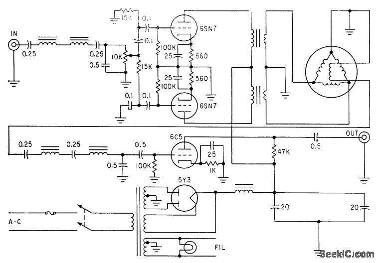 Consists of power supply, inverter, phase-shifting Selsyn, 100-cps filter, and output amplifier, used to vary phase of 100-cps frequency standard output by synchronization with WWV for studies of low-frequency propagation over long distances.-M. M. Newman etal, Sea-Going Lightning Generator, Electronics, 33:30, p 53-55.