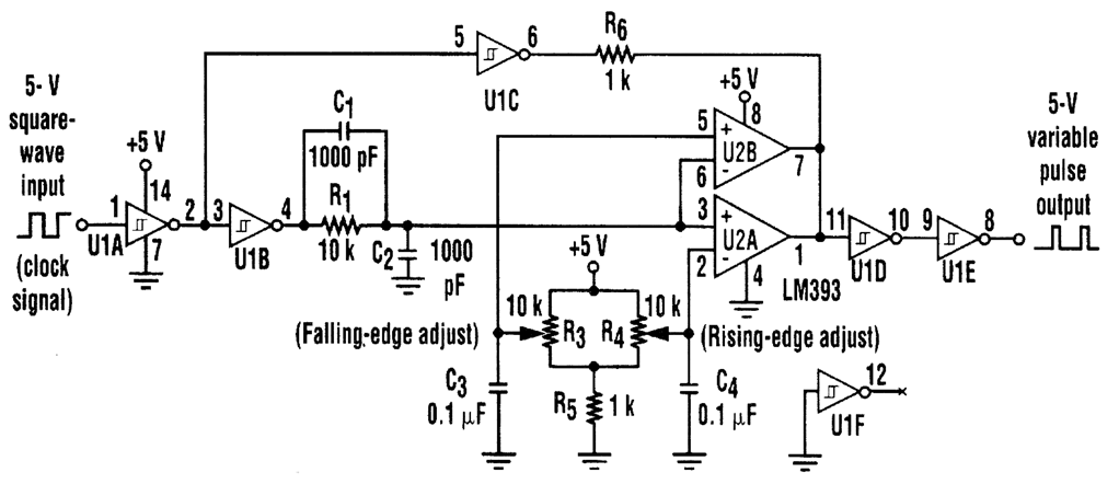 At times, it is necessary to produce pulses of adjustable width and whose start times might vaty with reference to a master clock. The input signal is inverted and buffered by U1A, while U1B and U1C reinvert the signal to produce square, buffered renditions of the input signal. Potentiometers R3 and R4 set references for the comparators.The input polarity of U2A keeps its output transistor tumed on until the voltage at the nonin-verting input exceeds the reference set by R4 (the rising edge adjustment). When this reference voltage is exceeded, the output transistor is turned off and the output signal is pulled up via R6.Meanwhile, the input polarity of U2B keeps its output transistor turned off until the voltage at the in-verting input exceeds the reference set by R3 (the falling edge adjustment). When this reference voltage is surpassed, the output transistor of U2B is turned on, pulling the output signal low through the wired-OR conftguration of U2. The output of U2 is then double-inverted and buffered by U1D and U1E. What results is a pulse whose start time (rising edge) can be adjusted by R4, and whose stop time (falling edge) can be adjusted by R3.The output of the comparators is pulled up to the input waveform through resistor R6 to U1C.This prevents the comparators from switching during the low cycle of the input waveform, regard-less of the positions of R3 and R4. This has the effect of locking out changes during the low period of the input signal, and would probably require additional logic if it were done strictly in the digital domain.The circuit, with the component values shown, works well between about 50 and 150 kHz.