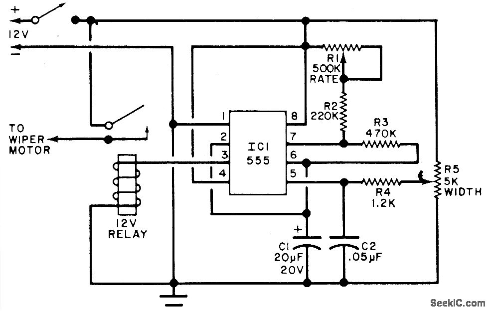 The relay which applies power to the wiper motor is actuated at periodic intervals by the timer circuit, closing the wiper motor contacts.R5 Potentiometer R1 serves as the pulse rate control and potentiometer R5 as the pulse width control. These two controls should be adjusted for optimum performance after the unit is installed in a car.