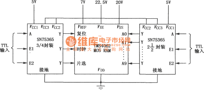 The SN75365 is one kind of TTL-MOS driver that has four NAND functions, this device is the connector between TTL circuits and high current or high voltage systems, so it drives the large capacitive loads andcan be usedwith a variety of common-MOS or RAM device. Also this device has the high-conversion speed, low power consumption, and each two drives have two public enable input pins, and the SN75365 has standard bipolar and MOS-circuit power supply. The wiring diagram of the SN75365 of type 4062 P-channel MOS RAMis as shown.