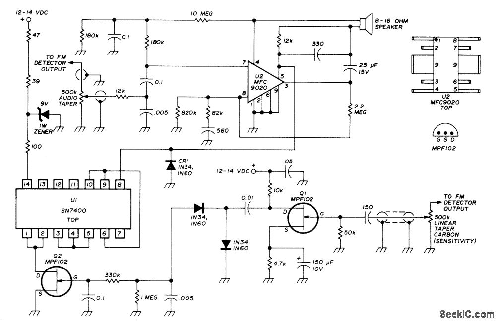 Simple system with sharply de-fined threshold can be added to any FM receiver. Circuit includes conventional IC audio amplifier. Audio is taken from FM detector output by shielded audio line and filtered by U2 to drive loudspeaker. Similar arrangement (below) connects FM detector output to 500K squelch sensitivity control, for amplification by Q1 and rectification. Q2 is turned off at thresh-old level determined by sensitivity control. Q2 then begins logic toggling action through U1.Low on pin 8 of U1 clamps off portion of U2,quieting loudspeaker. Signal carder reverses process, passing audio to loudspeaker. No-signal noise output voltage from FM detector should be at least 0.75 VAC. Circuit eliminates no-signal noise while allowing weakest desired signals to pass.-R. C. Harris, Versatile Squelch-Audio Amplifier for FM Receivers, Ham Radio, Sept. 1974, p 68-69.