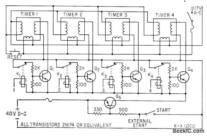 Low-cost transistor arrangement controls four precision timers used for simultaneous measurement of lime interval of four integrating circuits. Time between first digital output pulse and firing of circuit is determinable within 0.01%.-F. W. Kear, Tests Show Control is Key to Timer Accuracy, Electronics, 33:27, p 62.