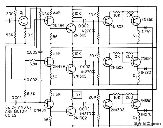 Unijunction ring counter energizes winding of stepper motor sequentially,-F.W. Kear, Digital Control Uses Unijunction Transistors, Electronics, 34:18, p 79-80.