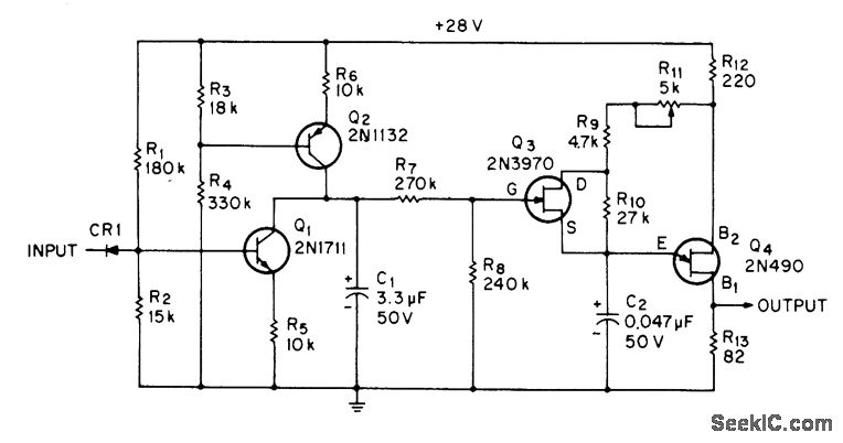 Variable UJT oscillator generates train of pulses under control of digital input logic levels, at 1000 pulses per second for logic 1 or 4400 pulses per second for logic 0, with smooth transitions between rates when logic changes, for driving stepping servomotor. Q1 and Q2 are constant-current sources. JFET Q3 acts as voltage-controlled variable resistor in parallel with R10, controlling pulse rate of UJT oscillator Q4.-C.R.Forbes.Step-Servo Motor Slew Generator. EEE Magazine.Oct.1970,p76-77.