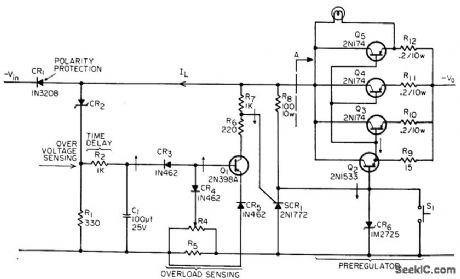 Uses signal from Q1 to trigger SCR1, which turns off series-pass transistor when overload reaches 15 amp. Will also provide limiting of output voltage at 25 V, input overvoltage protection at 32 V, and input reverse-polarity protection by CRL. -J. J. Rado, Versatile SCR Protection for Power Supplies, EEE, 13:8, p 56-62.